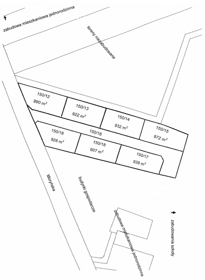 - Nieruchomości są niezabudowane, o kształcie regularnym. Teren porośnięty roślinnością trawiastą, nieuzbrojony (znajduje się w zasięgu sieci wodnej, kanalizacyjnej, gazowej oraz energetycznej), posiada użytek Bp (zurbanizowane tereny niezabudowane). W najbliższym sąsiedztwie zabudowa mieszkaniowa jednorodzinna, garaże, budynki gospodarcze oraz tereny niezainwestowane.