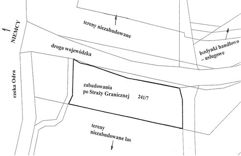 Przedmiotowa nieruchomość znajduje się na terenie, dla którego nie ma w chwili obecnej obowiązującego planu miejscowego. Wystąpiono o decyzję o warunkach zabudowy działki. Nieruchomość zabudowana, oznaczona numerem działki 241/7 o powierzchni 0,6340 ha, położona w obrębie ewidencyjnym Osinów Dolny, gmina Cedynia. Zgodnie z danymi ewidencji gruntów i budynków posiada użytek Bi (inne tereny zabudowane).Działka jest zabudowana budynkiem administracyjnym i dwoma pawilonami kontenerowymi (magazynowo - socjalnymi). Nieruchomość położona jest w obrzeżnej, południowo - zachodniej części wsi, w bezpośrednim sąsiedztwie rzeki Odry, stanowiącej granicę Państwa. Nieruchomość jest o kształcie regularnym i zwartym, zbliżonym do prostokąta. Teren jest płaski i równy z nieznacznym pochyleniem w kierunku południowym. Teren działki częściowo ogrodzony, porośnięty roślinnością trawiastą, młodym drzewostanem a także krzewami ozdobnymi. Przy południowo - zachodnim narożniku budynku administracyjnego posadowiony jest stalowo - kratowy maszt antenowy. Potencjalny nabywca zobowiązany będzie do udostępnienia wg potrzeb części nieruchomości (parkingów) celem przywrócenia kontroli granicznej realizowanej w imieniu Rzeczpospolitej Polskiej przez Straż Graniczną, na warunkach ustalonych pomiędzy stronami.